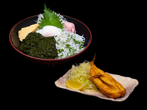 地ふぐのから揚げ+釜あげしらすあかもく温たまのせ丼